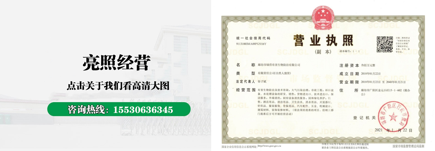 廊坊市綠營有害生物防治有限公司主要從事有害生物防治及環(huán)境消毒服務(wù),專注于白蟻預(yù)防工程、滅白蟻、滅老鼠、滅蟑螂、滅蚊蠅、滅跳蚤、滅臭蟲、滅紅火蟻、滅塵螨、消毒滅菌、家居清潔等有害生物的預(yù)防和治理服務(wù)。本公司面向,公共場所、商務(wù)樓、商場、超市、公園、工廠、酒店、餐廳、浴場、私人住宅等各類環(huán)境,公司一直堅(jiān)持以健康環(huán)保為前提,讓我們多一份健康”為宗旨,結(jié)合安全、、無反彈、對人畜安全無害,解決您的后顧之憂,與您共同打造一個(gè)無害、潔凈、舒適、健康的生活環(huán)境。...